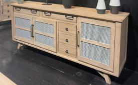 Résultat d’une grande recherche en termes d’identité, l’enfilade ESCALE associe caractère et agencement bien pensé. Ne vous laissez pas surprendre par son habile jeu de 3 tiroirs en trompe-l’œil conçu pour rompre la monotonie, cette enfilade en chêne massif se compose bel et bien de 4 portes, disponibles en version bois ou cannage, surplombées de 2 grands tiroirs à la finition contrastée. D’une belle longueur de 223,5 cm, ce meuble habillera efficacement un mur de votre pièce de vie, en vous offrant de grands rangements à l’abri des regards et de la poussière.