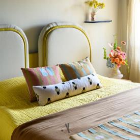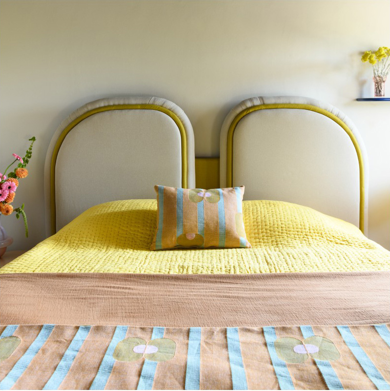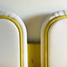 La designer a imaginé la tête de lit en clin d’oeil à l’union de deux personnes dans un lit. La pièce est synonyme d’amour, de lien entre deux entités réunies grâce à un trait d’union matérialisé.
