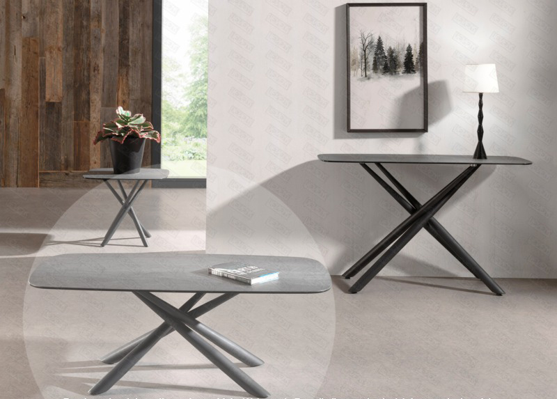 Dimensions : l 116 x h 45 x p 60 cm Plateau en céramique de 4 mm collé sur un plateau en verre trempé de 6 mm. Pieds : métal avec revêtement en poudre noir. table basse