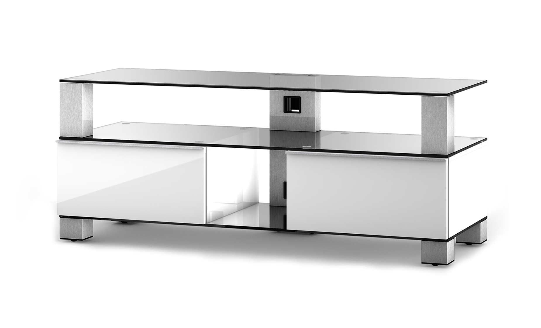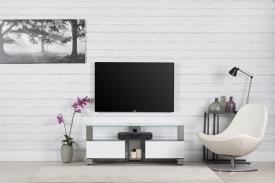 La combinaison du verre transparent, de l’inox et du blanc laqué donne à ce meuble TV un look tendance et moderne.