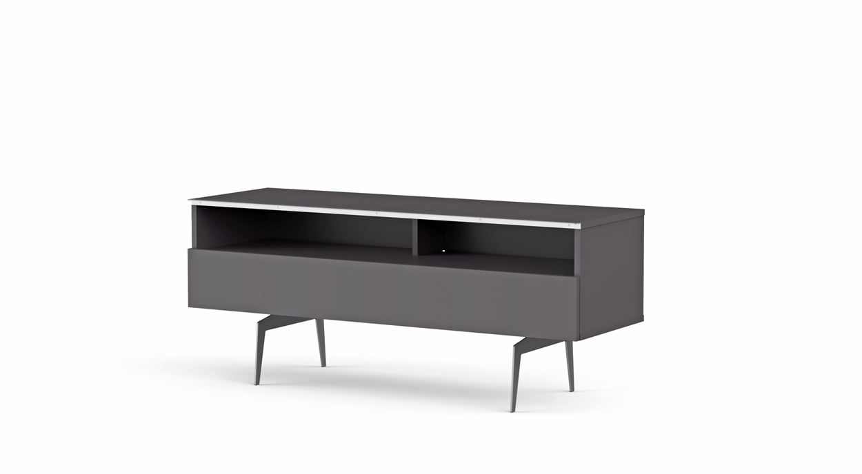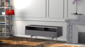 - Demi-porte abattante de couleur grise permettant de laisser la partie supérieure du caisson ouverte pour pouvoir utiliser sa barre de son et piloter ses appareils sans ouvrir le meuble.