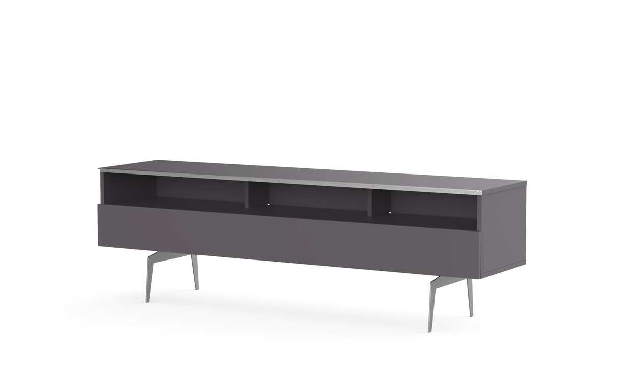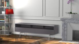 - Demi-porte abattante de couleur grise permettant de laisser la partie supérieure du caisson ouverte pour pouvoir utiliser sa barre de son et piloter ses appareils sans ouvrir le meuble.