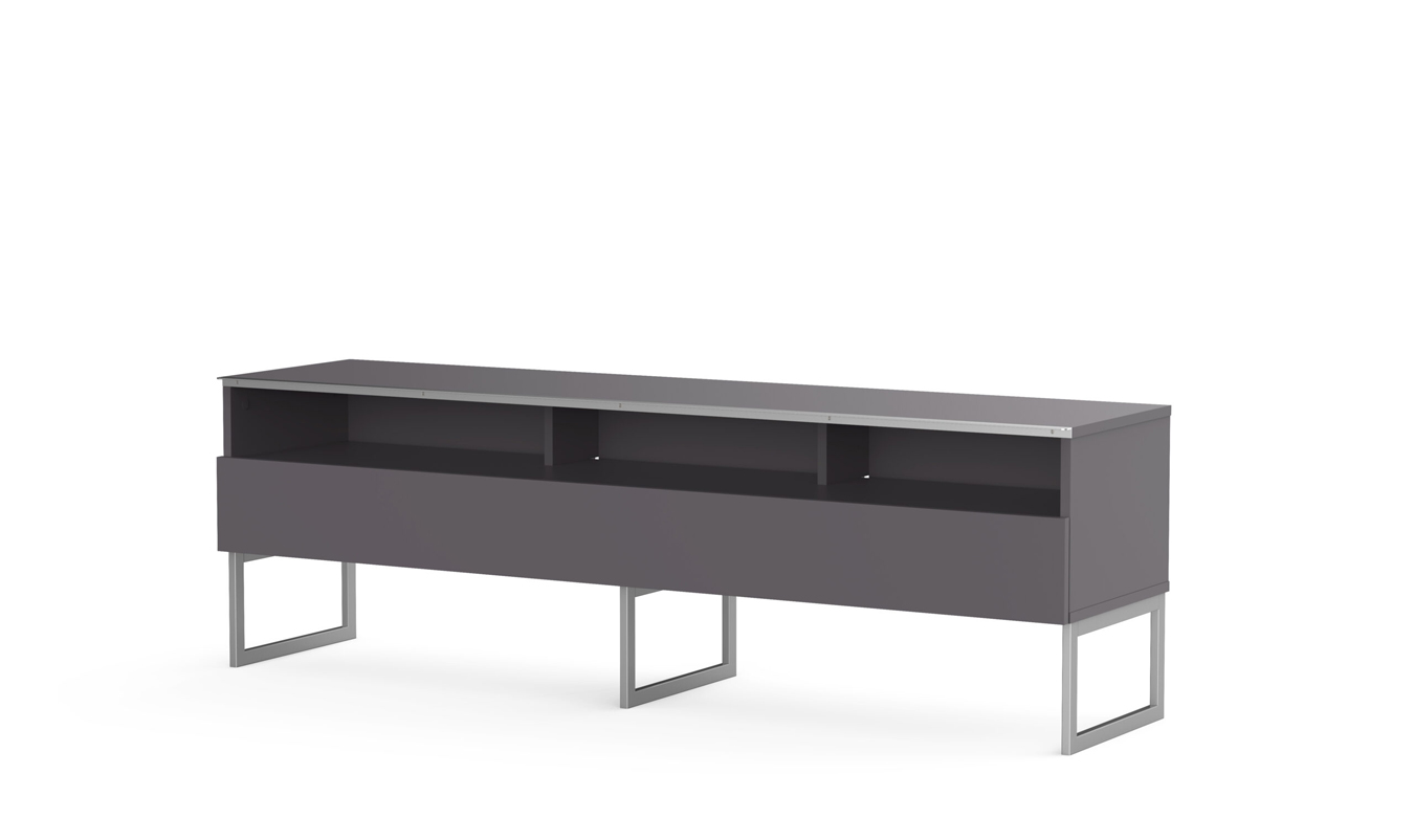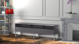 - Demi-porte abattante de couleur grise permettant de laisser la partie supérieure du caisson ouverte pour pouvoir utiliser sa barre de son et piloter ses appareils sans ouvrir le meuble.