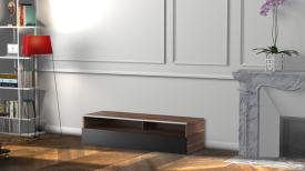 - Demi-porte abattante de couleur noire permettant de laisser la partie supérieure du caisson ouverte pour pouvoir utiliser sa barre de son et piloter ses appareils sans ouvrir le meuble.