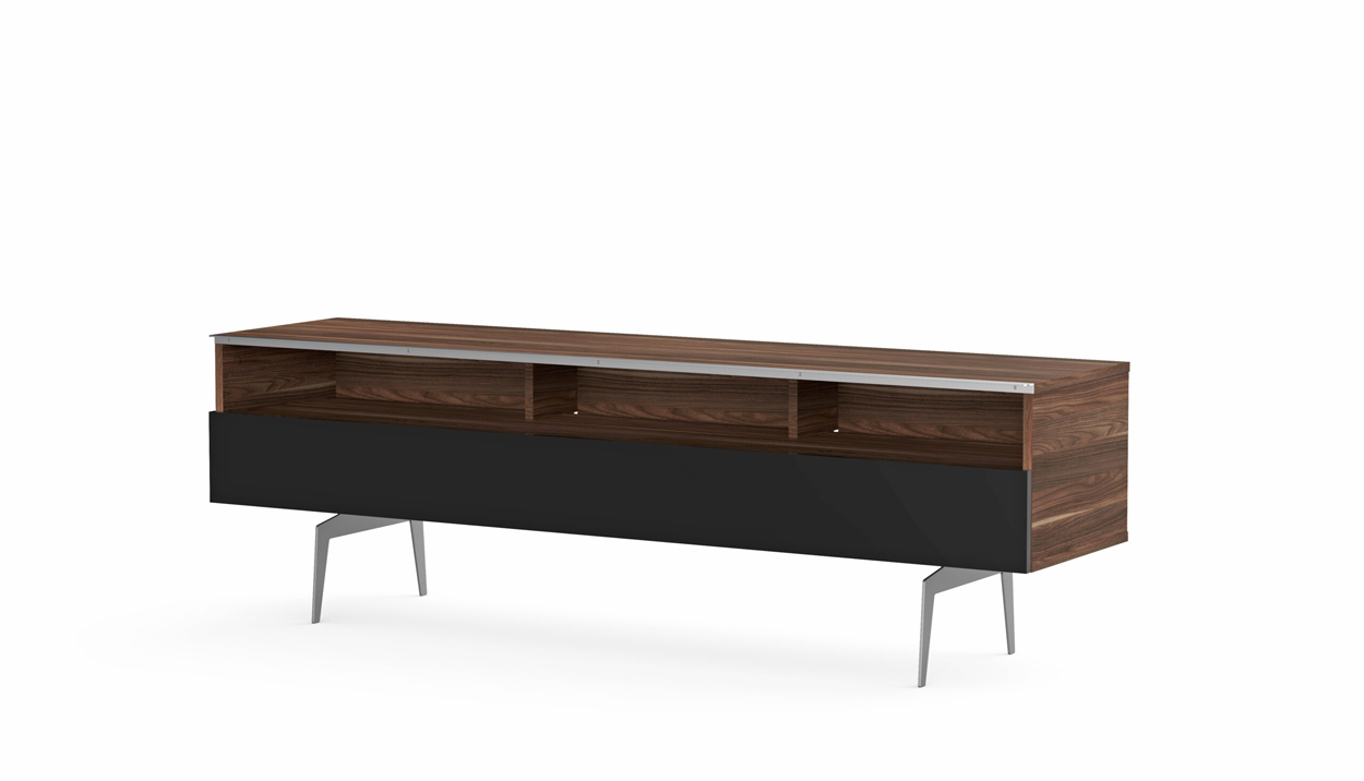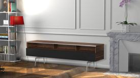 - Demi-porte abattante de couleur noire permettant de laisser la partie supérieure du caisson ouverte pour pouvoir utiliser sa barre de son et piloter ses appareils sans ouvrir le meuble.