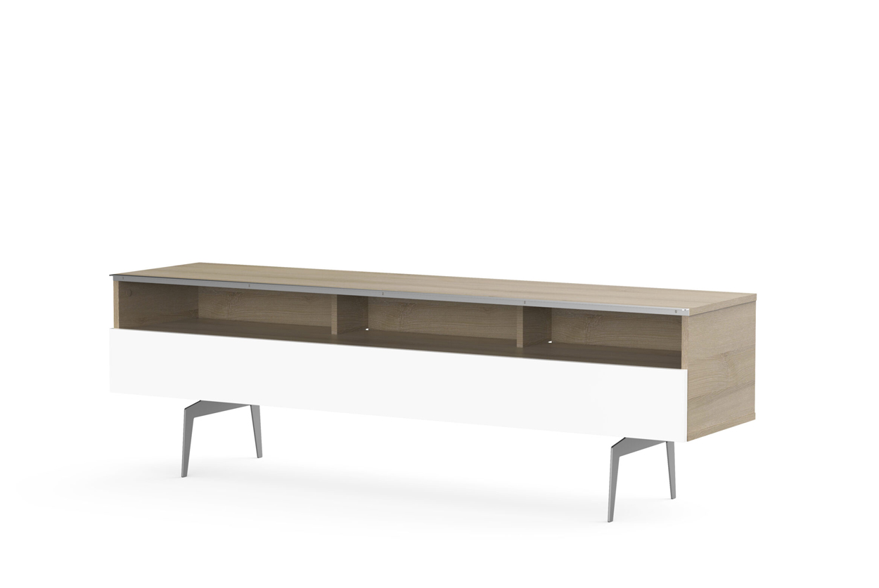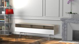 - Demi-porte abattante de couleur blanche permettant de laisser la partie supérieure du caisson ouverte pour pouvoir utiliser sa barre de son et piloter ses appareils sans ouvrir le meuble.