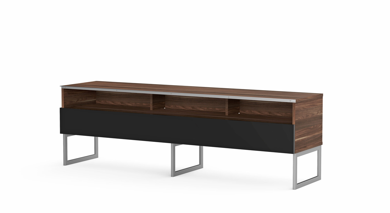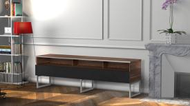 - Demi-porte abattante de couleur noire permettant de laisser la partie supérieure du caisson ouverte pour pouvoir utiliser sa barre de son et piloter ses appareils sans ouvrir le meuble.
