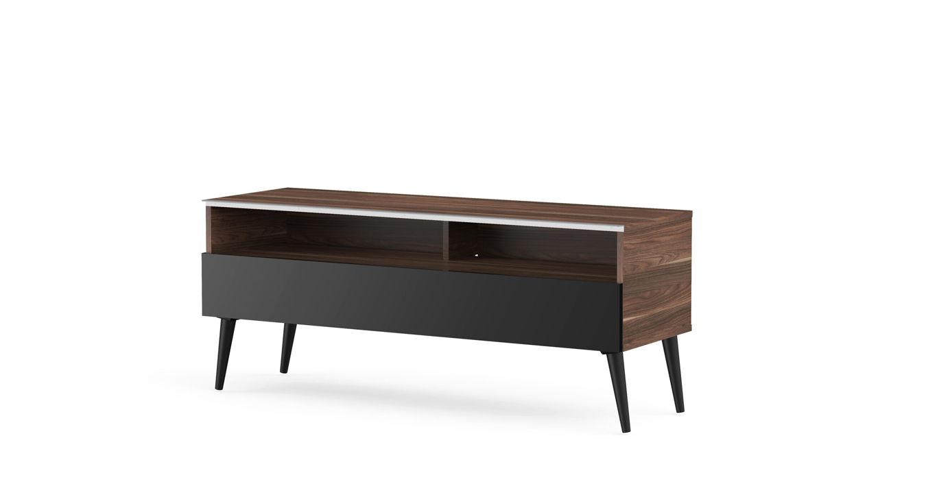 - Demi-porte abattante de couleur noire permettant de laisser la partie supérieure du caisson ouverte pour pouvoir utiliser sa barre de son et piloter ses appareils sans ouvrir le meuble.