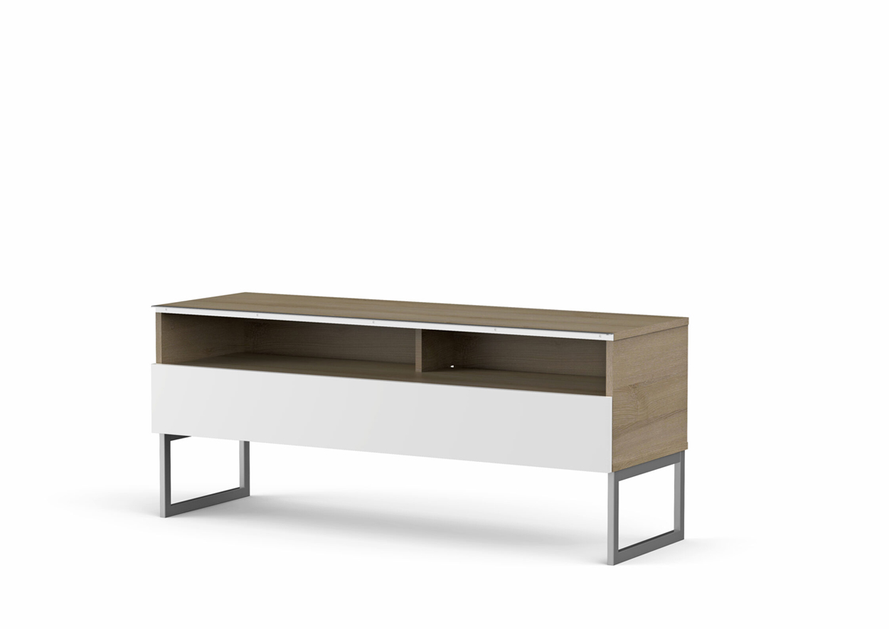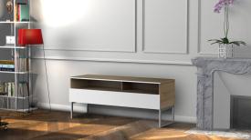 - Demi-porte abattante de couleur blanche permettant de laisser la partie supérieure du caisson ouverte pour pouvoir utiliser sa barre de son et piloter ses appareils sans ouvrir le meuble.