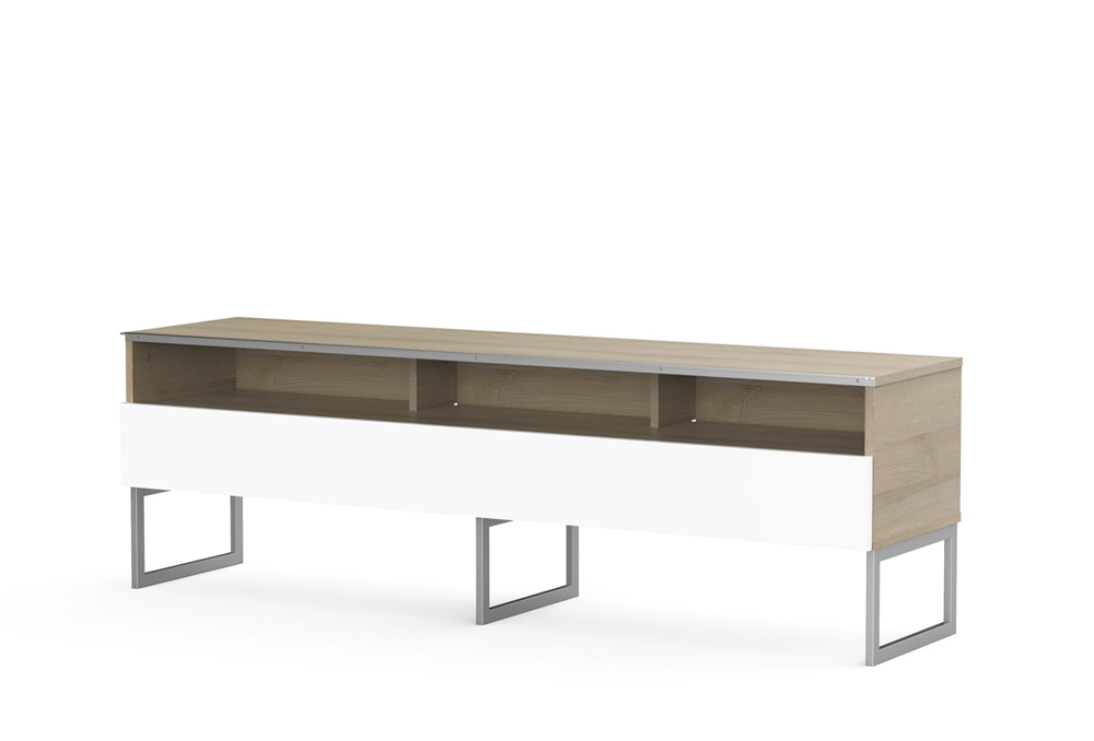 - Demi-porte abattante de couleur blanche permettant de laisser la partie supérieure du caisson ouverte pour pouvoir utiliser sa barre de son et piloter ses appareils sans ouvrir le meuble.