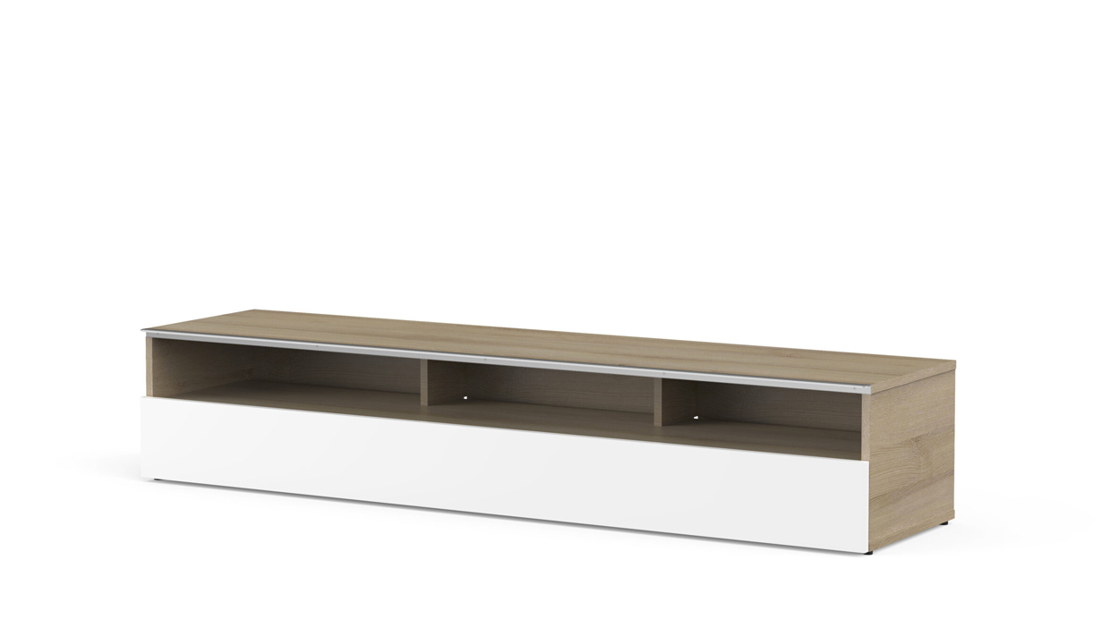 - Demi-porte abattante de couleur blanche permettant de laisser la partie supérieure du caisson ouverte pour pouvoir utiliser sa barre de son et piloter ses appareils sans ouvrir le meuble.