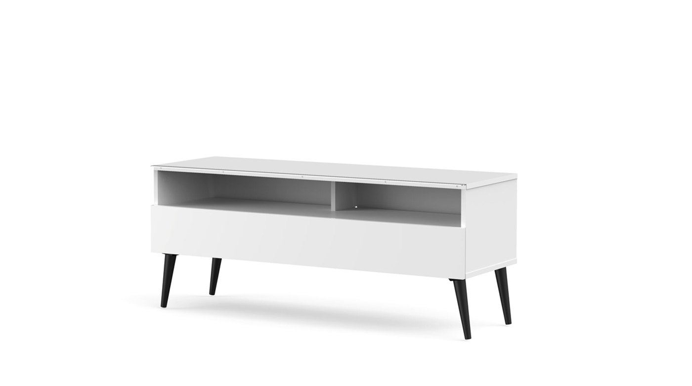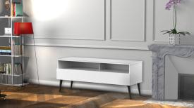 - Demi-porte abattante de couleur blanche permet de laisser la partie supérieure du caisson ouverte pour pouvoir utiliser sa barre de son et piloter ses appareils sans ouvrir le meuble.