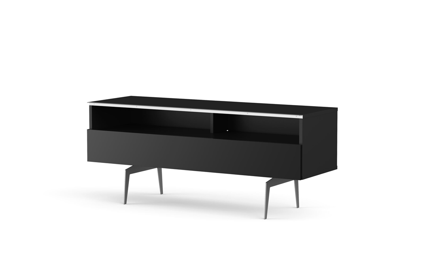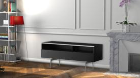 - Demi-porte abattante de couleur noire permettant de laisser la partie supérieure du caisson ouverte pour pouvoir utiliser sa barre de son et piloter ses appareils sans ouvrir le meuble.